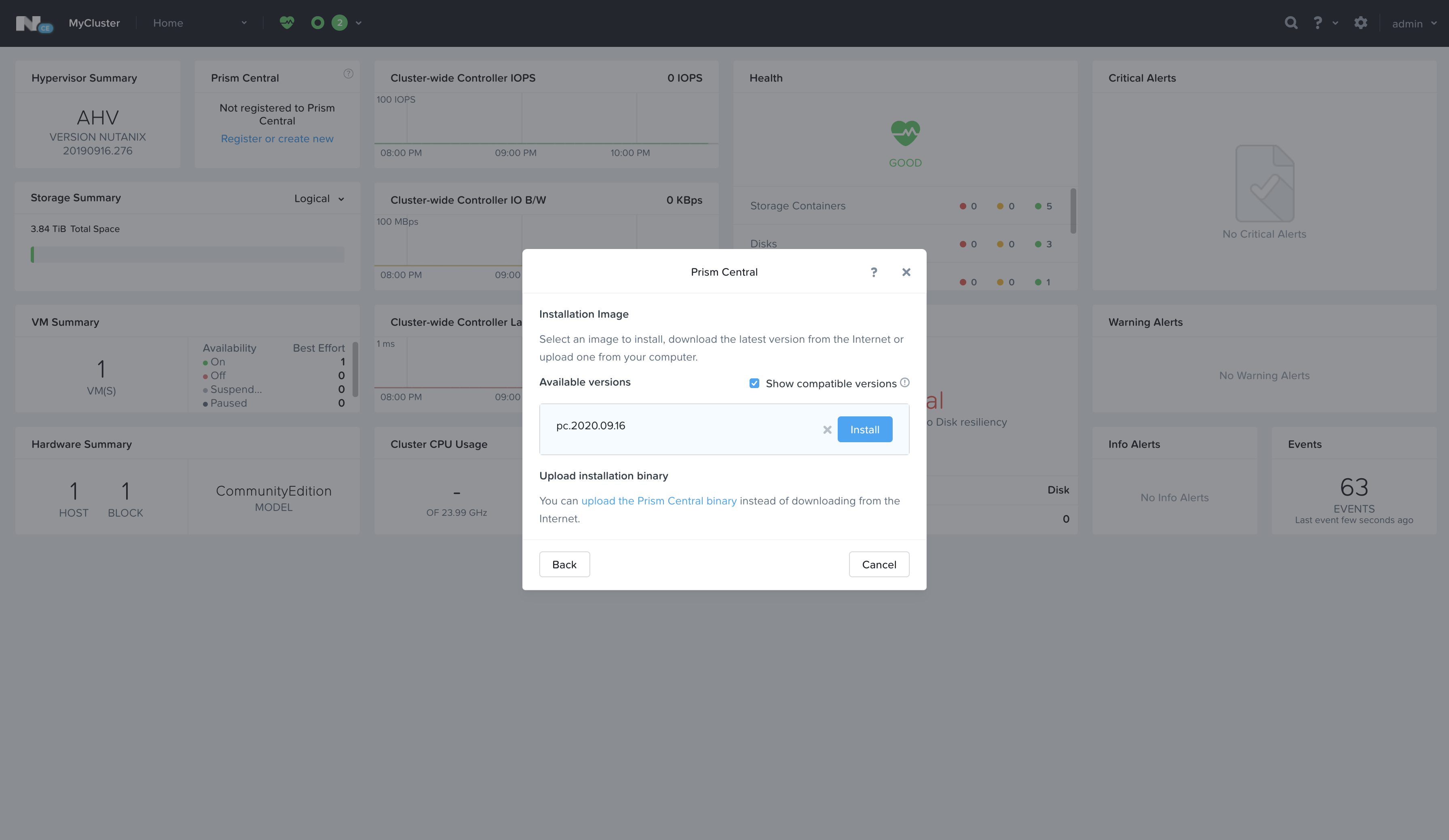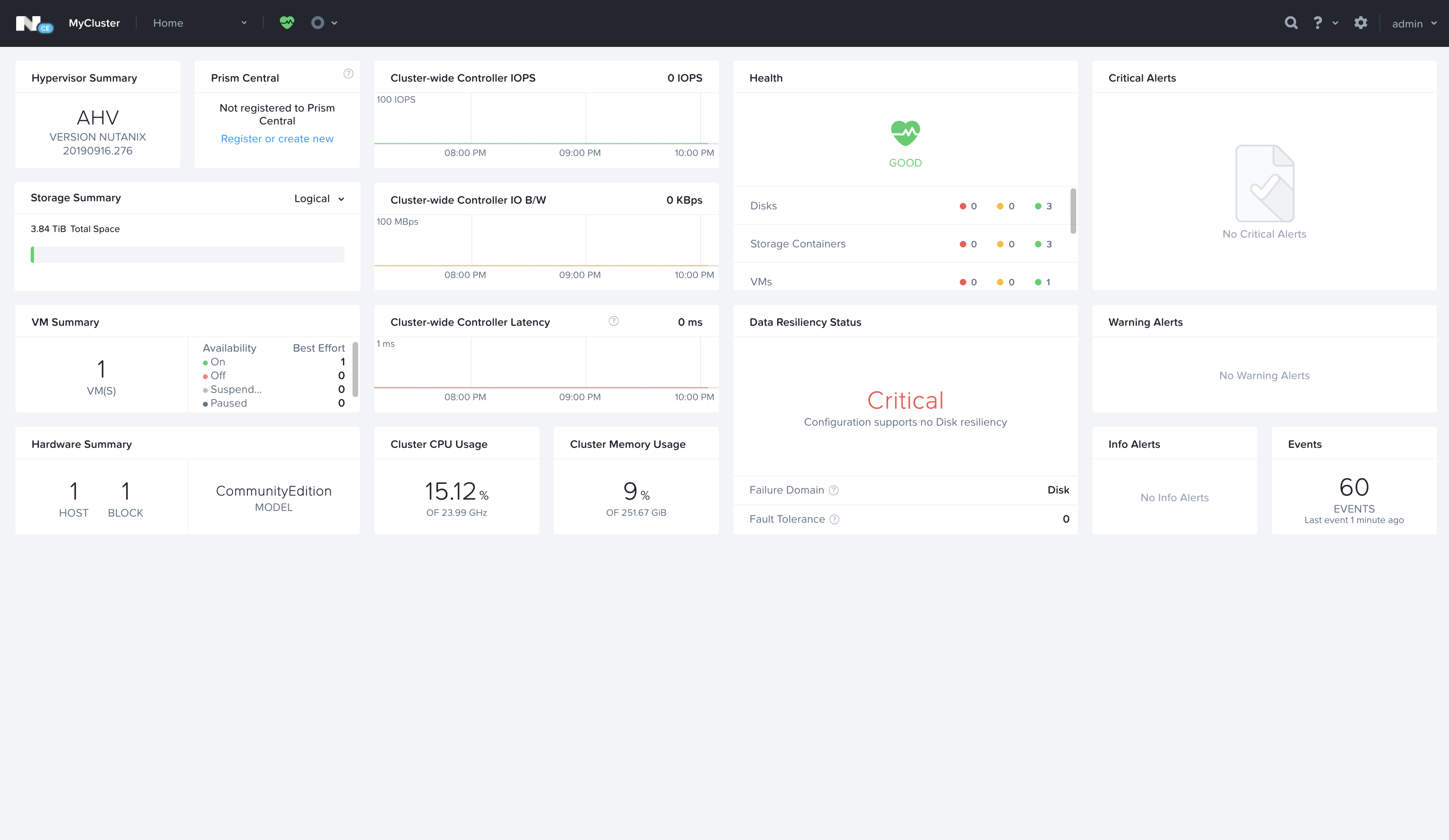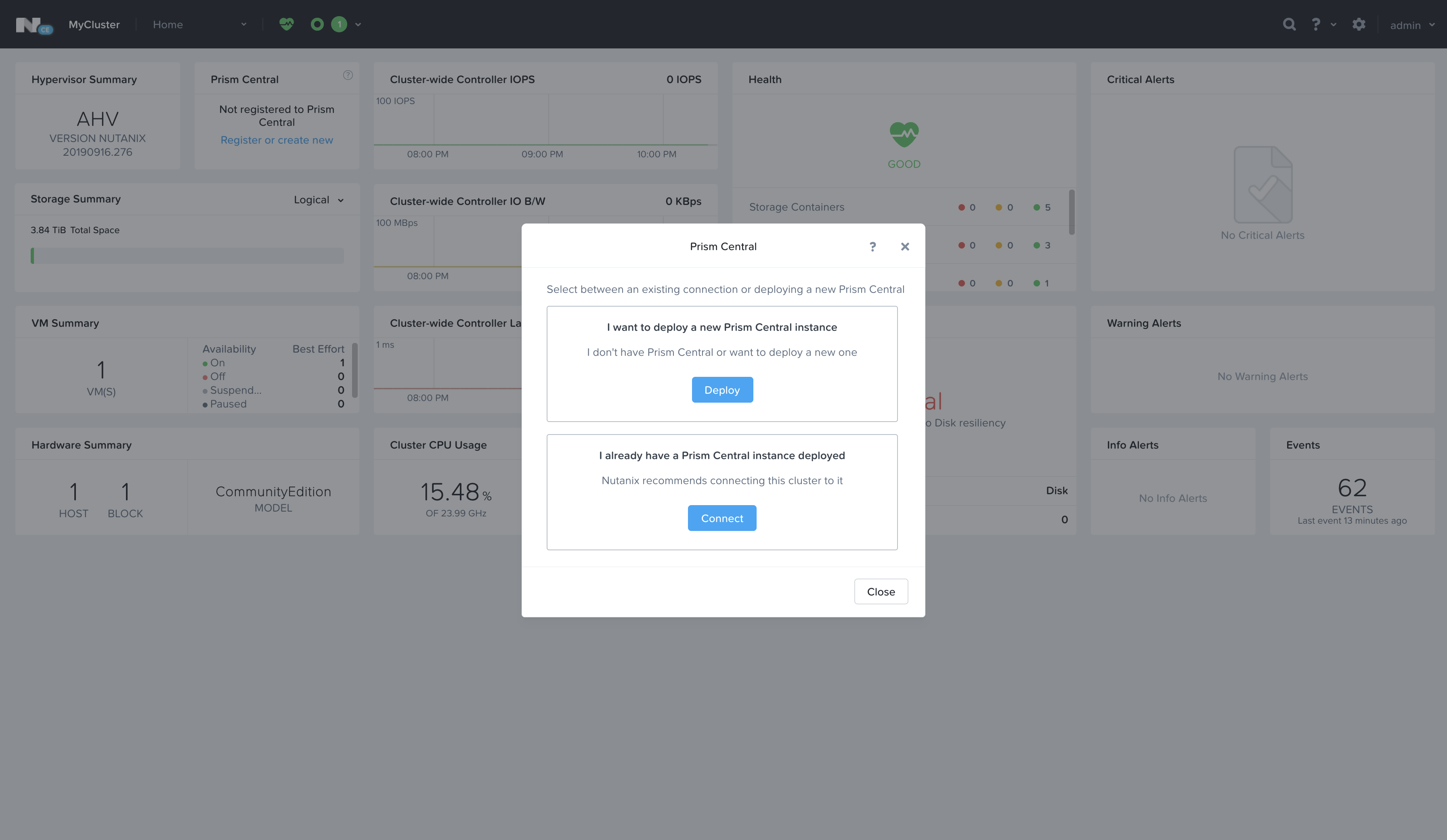 Navigate back to the Prism Element dashboard - you should see a block regarding Prism Central and that this instance is “Not registered to Prism Central.”
