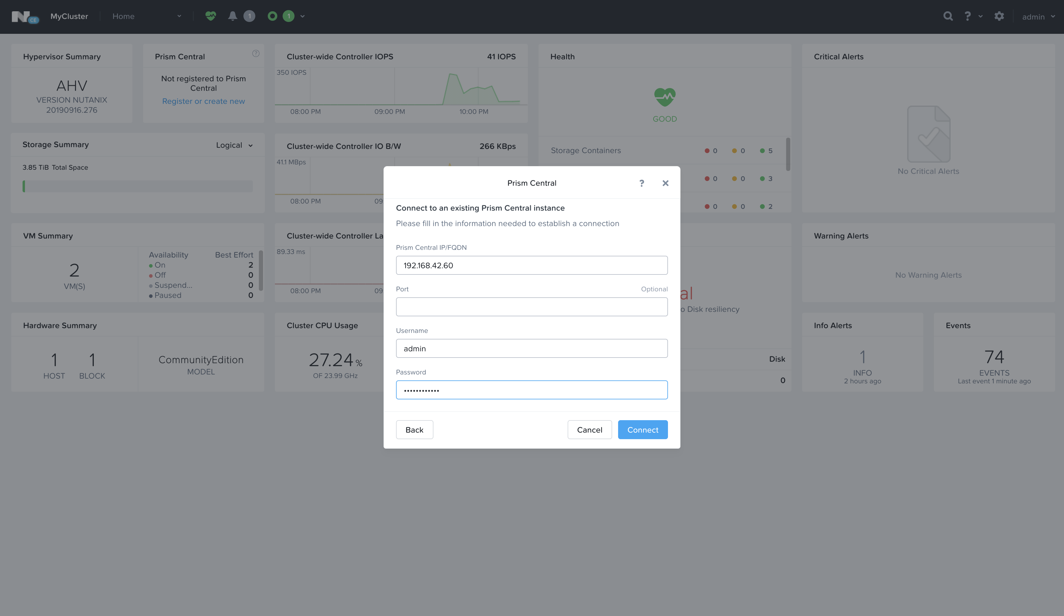 With the admin password and Nutanix Next credentials set in Prism Central, you can now navigate back to Prism Element and instead of deploying Prism Central, select the Connect option and follow the prompts.