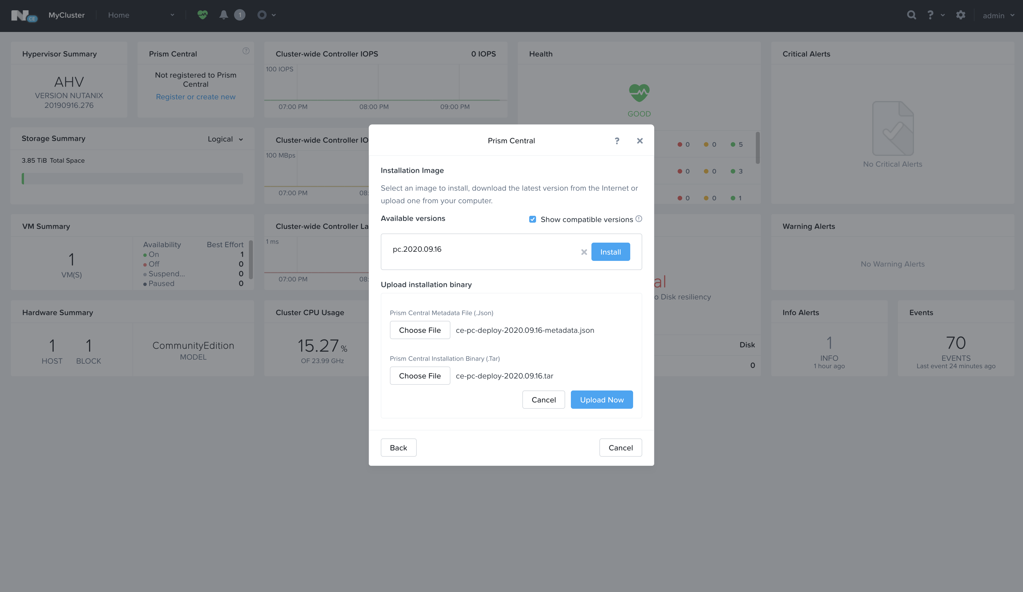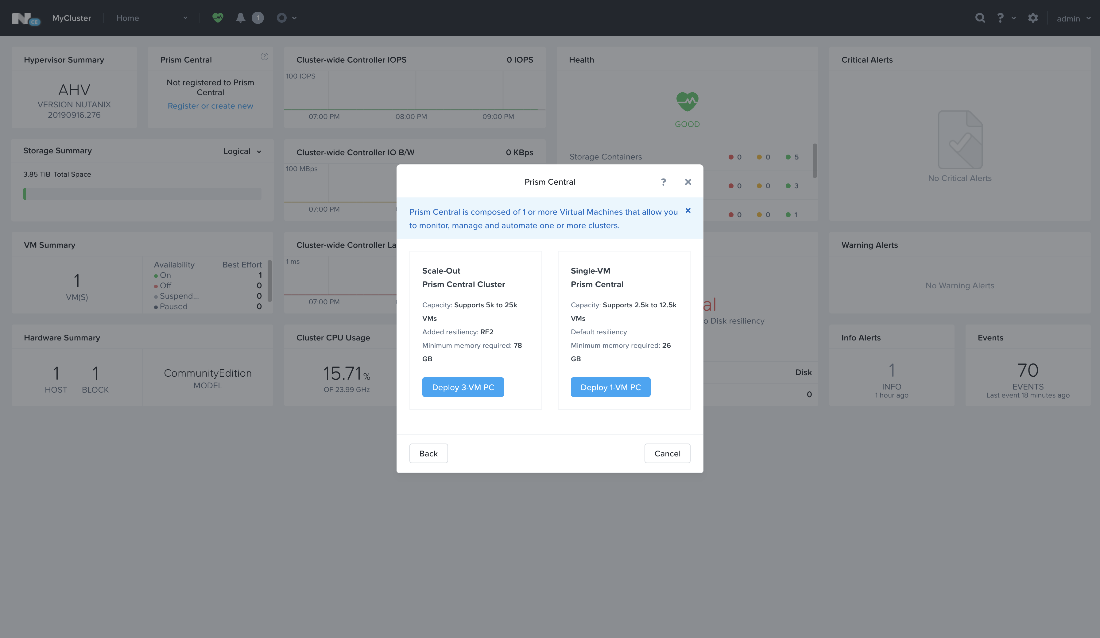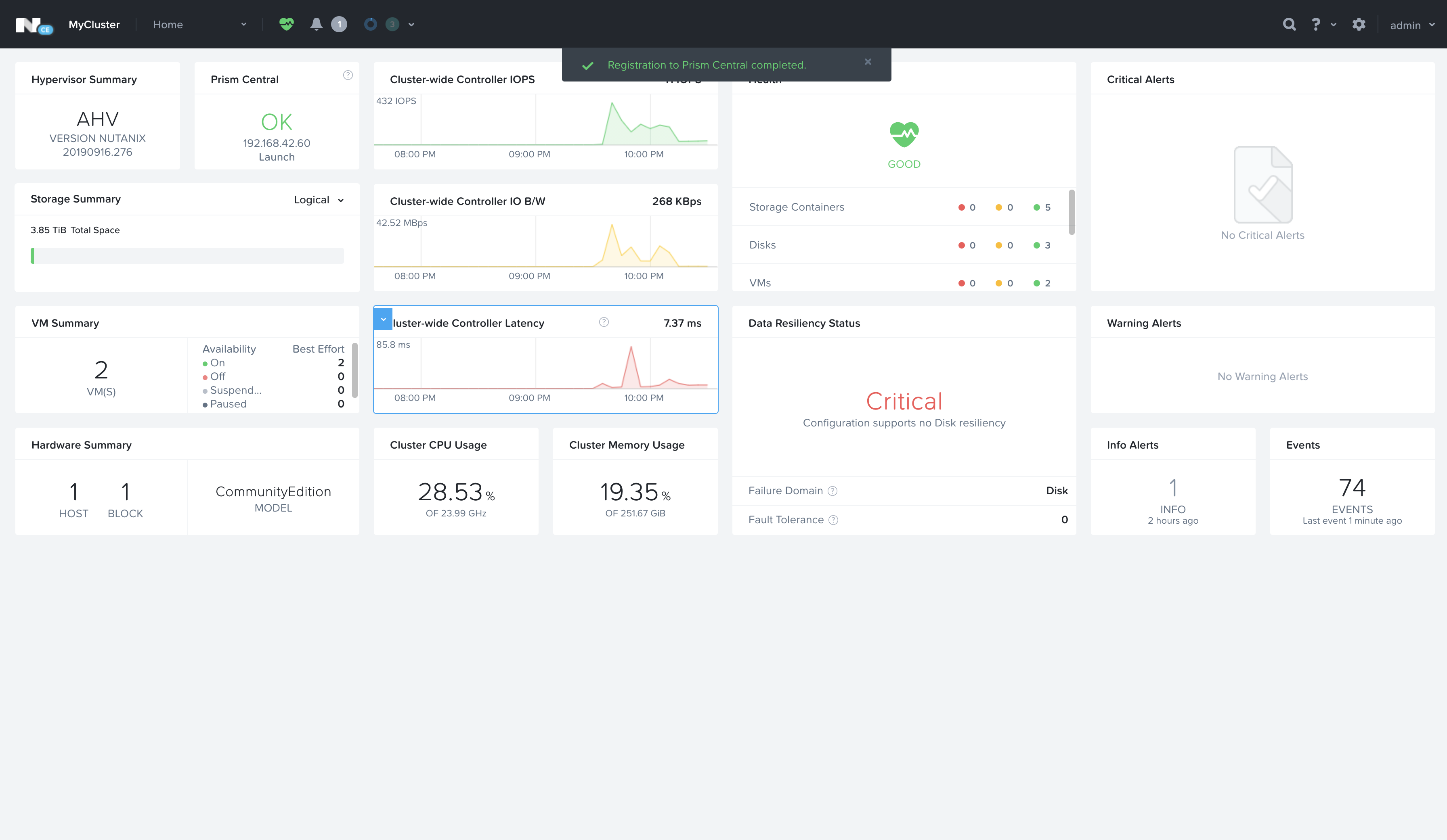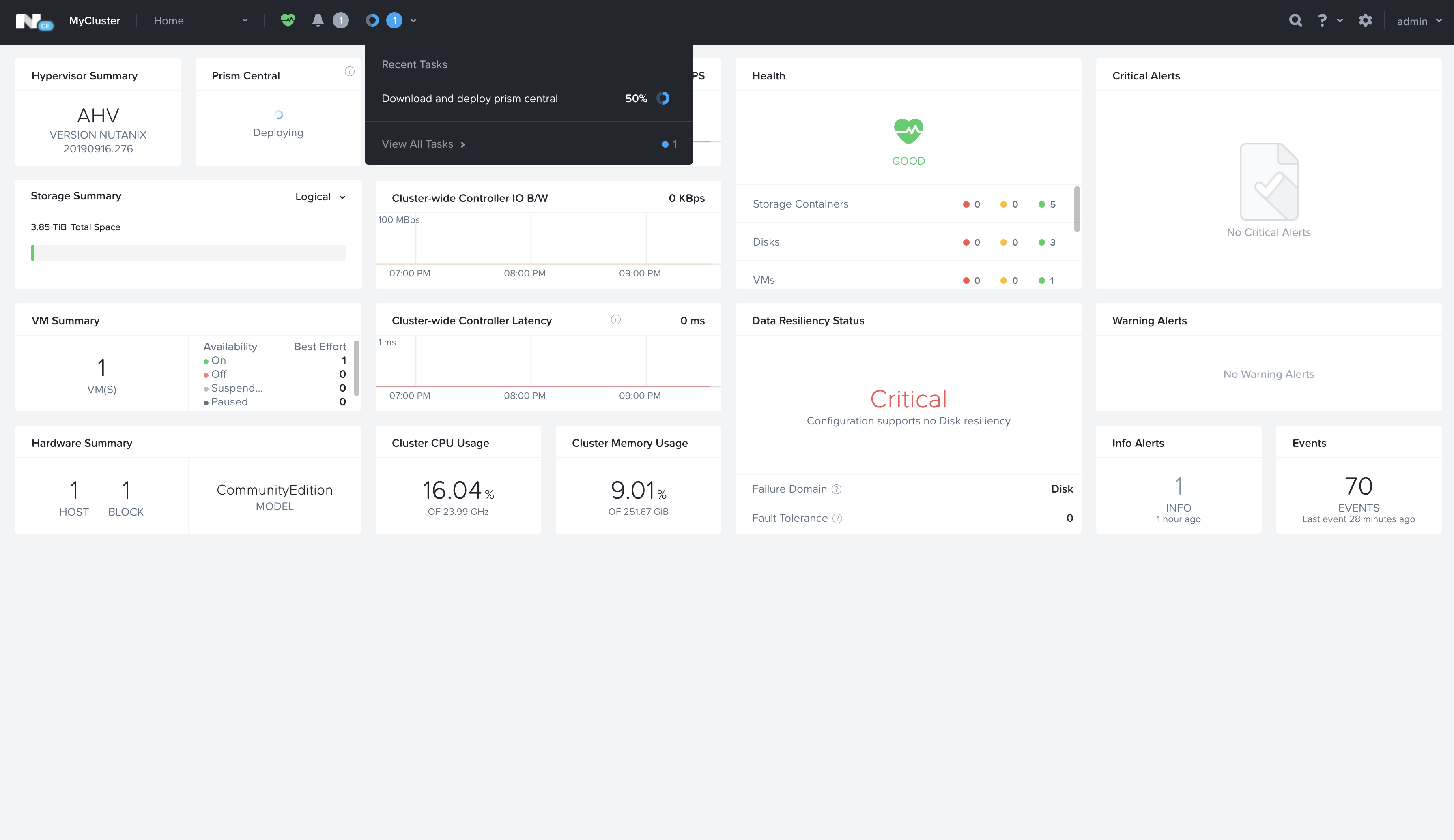 Note: Once Prism Central is initially deployed, the Prism Element dashboard does not show anything differently in that Prism Central block, in fact it’ll revert to saying “Not registered to Prism Central” - the only notification you get is the successful event execution in the Recent Tasks dropdown.