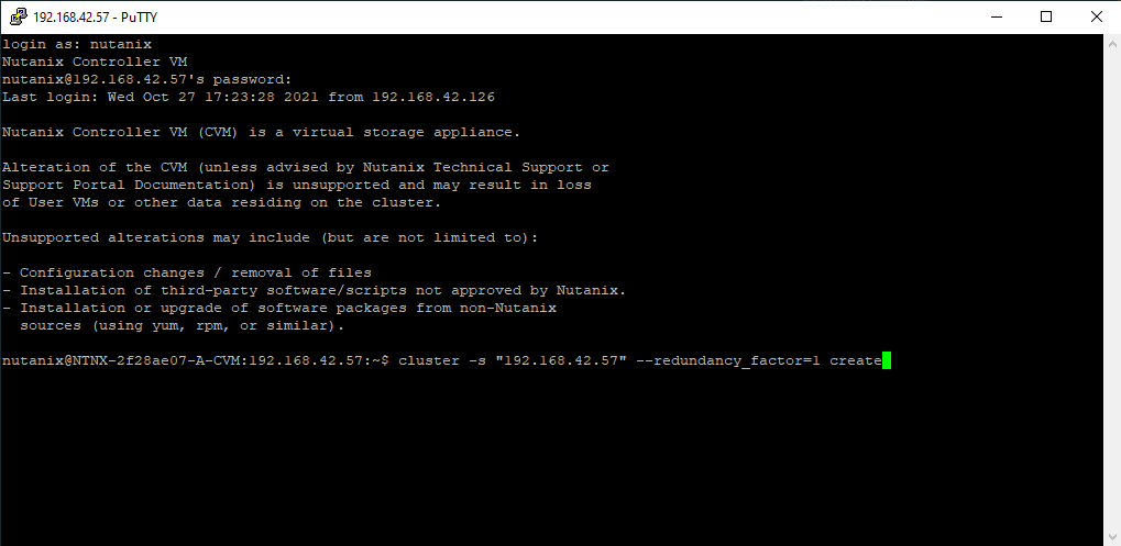 Now that you’re SSH’d into the CVM, you can run a few commands to create the cluster, making sure to change the IPs out: