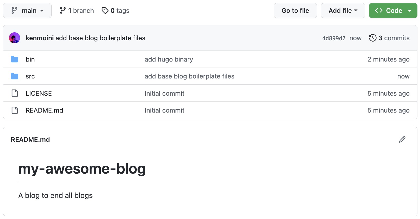 With that you should now have the Hugo binary added to your GitHub repository - navigate to it and it should now look a little like this: