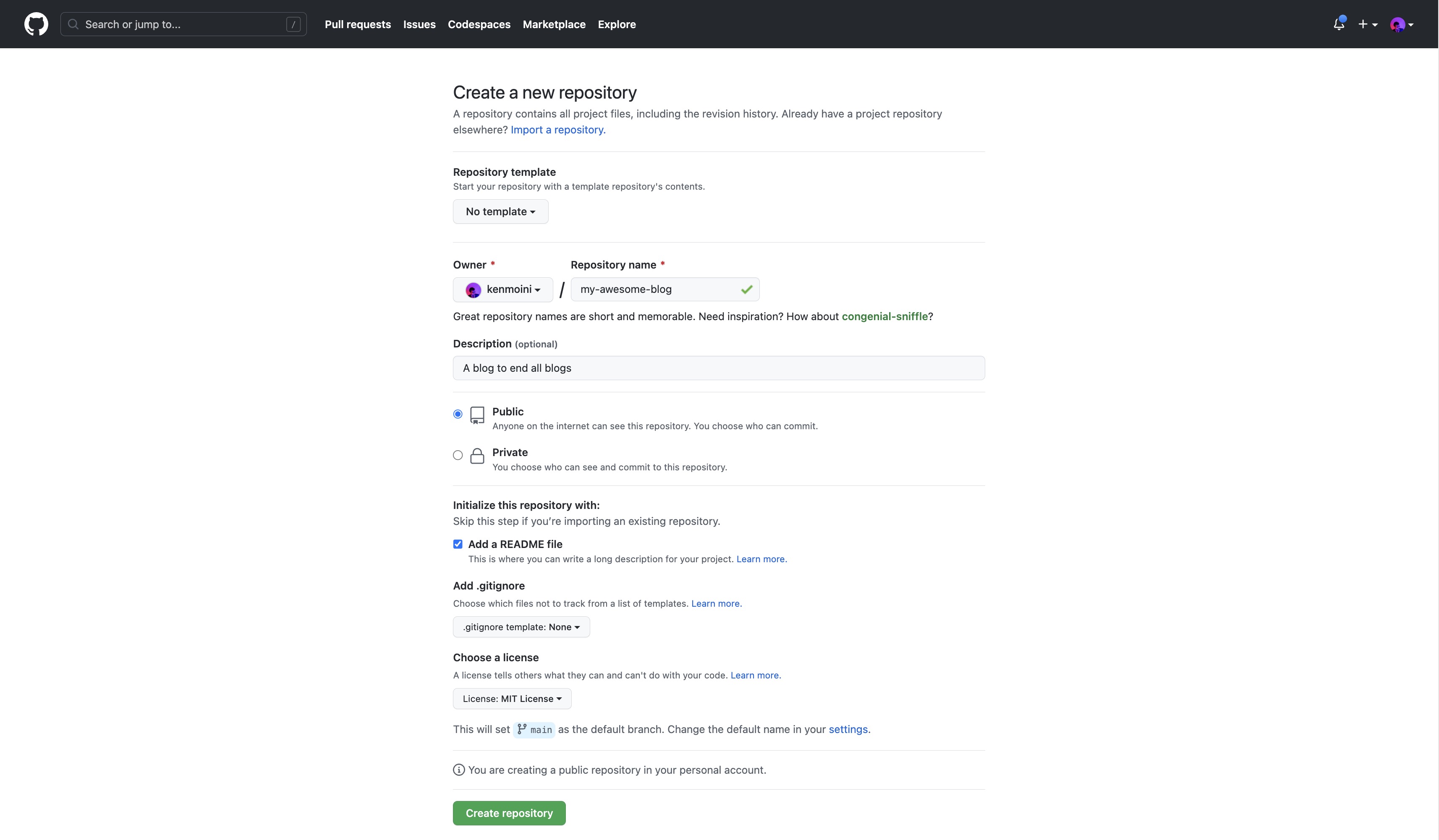 Something I would suggest though is going ahead and selecting a License and seeding the repo with a README. The license choice is up to you, I like the MIT license personally - the README file will be pretty bare but you can add to it later. The form should look something like this: